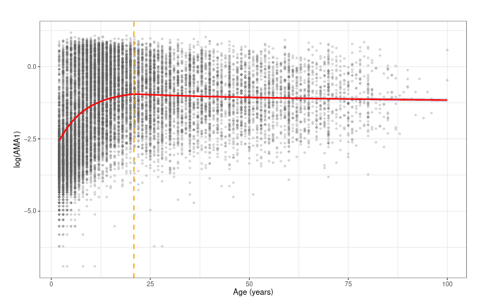 Interpretation in the latent sero-reactivity framework \[ \mathbb{E}[T;a] = \frac{f(a)-\mu_0}{\mu_1-\mu_0} = 1 - \exp(-r a), \]