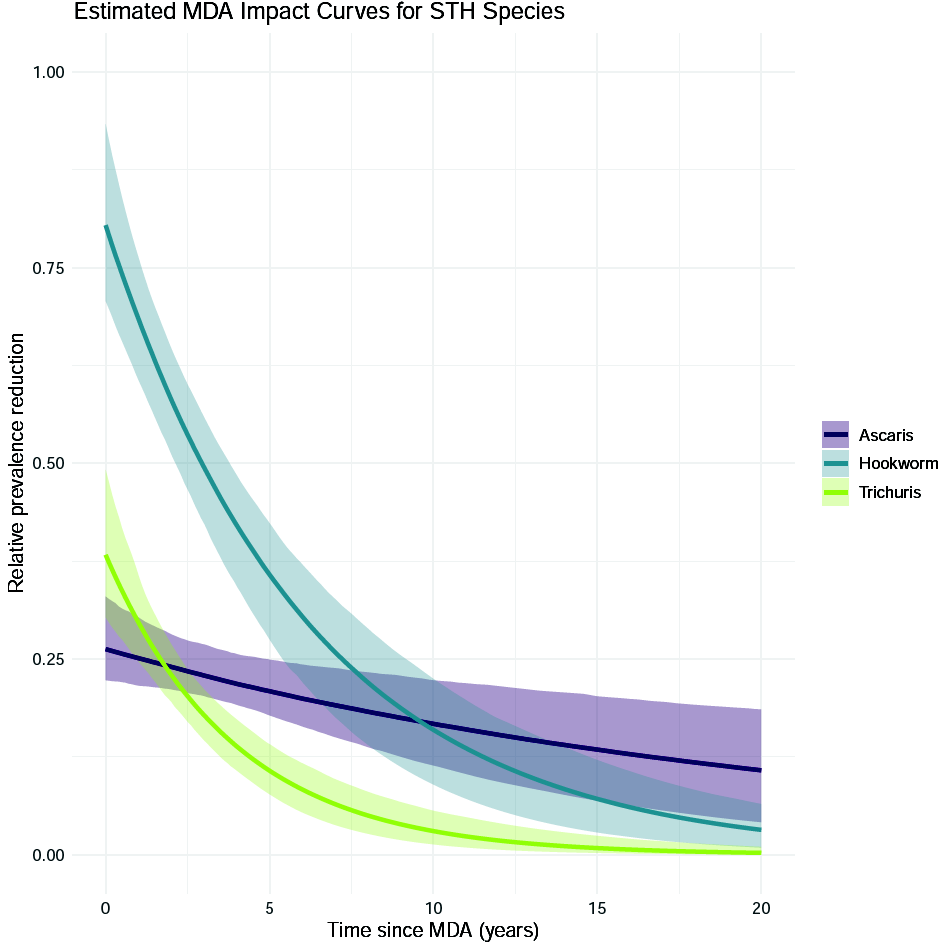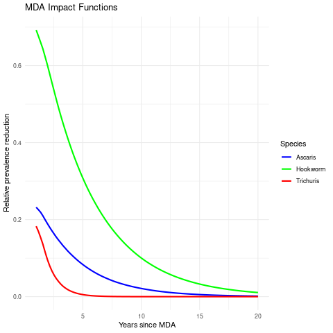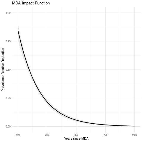 MDA impact function: \(f(v) = \alpha\exp\{-v/\gamma\}\), with \(v\) denoting the years since last MDA