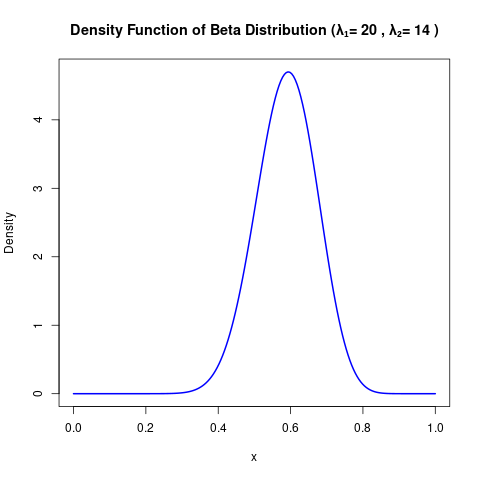 - We set \(\lambda_1 = 20\) and \(\lambda_2 = 14\). (This inspired by a Beta distribution with mode in around 0.6, with 0.42 and 0.7 as its 0.025 and 0.975 quantiles, respectively.)