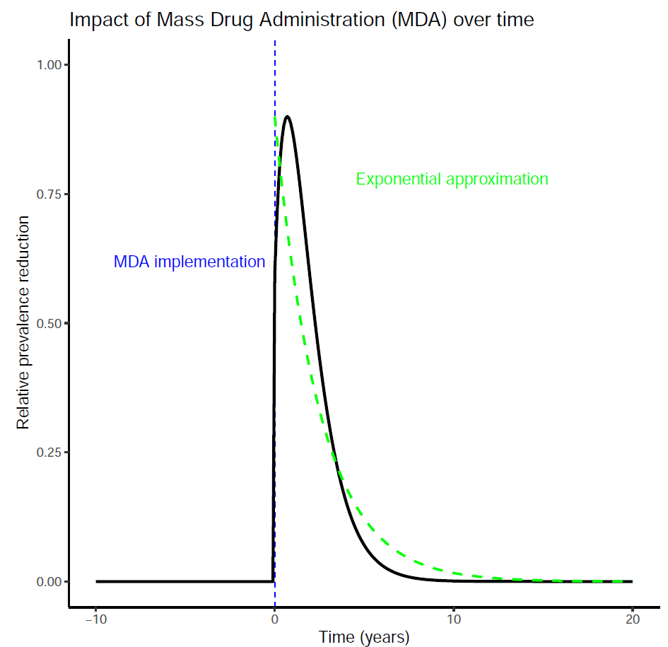 A2 — Transient MDA effect: Allow partial permanence once prevalence drops below an elimination threshold \(p^*\): \[ f(x,t) = \alpha \left[(1 - r(x,t))\exp\left\{-\frac{t - t^*(x,t)}{\gamma}\right\} + \delta \times r(x,t)\right], \] where \(r(x,t) = I\{P(x, t^-) < p^*\}\)